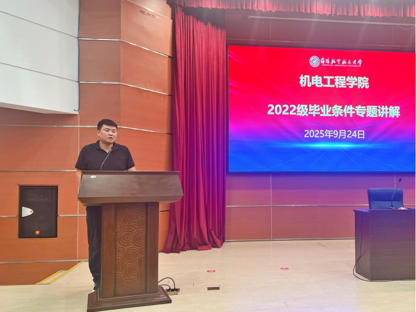 为帮助2022级学生明晰毕业要求、科学规划学业,9月24日下午,机电工程学院在图书馆国内学术报告厅举办了2022级本科生毕业条件解读会。会议由2022级本科生辅导员闫宇航主持,学院教务秘书何雯担任主讲,全体2022级本科生参会。