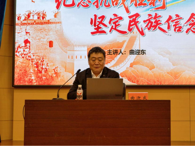 课堂上,曲迎东以中国人民抗日战争的历史脉络为主线,通过生动鲜活的英雄案例、详实有力的历史数据,系统梳理了抗战历程中的关键节点与重大事件,带领师生重温了那段艰苦卓绝、可歌可泣的峥嵘岁月。他强调,无数革命先烈用生命和鲜血铸就的伟大抗战精神,是中华民族弥足珍贵的精神财富,更是新时代中华儿女砥砺前行、奋勇争先的强大精神动力,必须永远铭记、代代传承。
